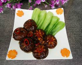 关火出锅,把香菇摆放在油菜上,淋上剩余的料汁,稍加点缀