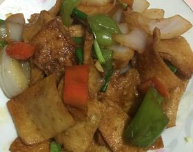 千叶豆腐入锅,加五香粉、蚝油、红烧酱汁(老抽也可)、少许盐,出锅时加少许鸡精。