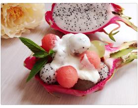 用挖球勺把果肉挖成小球,留完整的外皮作为装沙拉的容器。