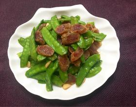 当荷兰豆炒至变脆绿色时,放入切好的腊肠翻炒,这时可加少量水继续翻炒均匀。