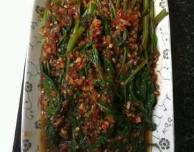 锅下油,把大蒜红辣椒剁小,一起放油锅里炒香,放适量的水,下调味料,生抽,盐,鸡精,起锅盖在装好盘的空心菜身上即可。