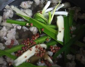 放入锅中,再放入佐料,葱,花椒,山艿,生姜,少许盐