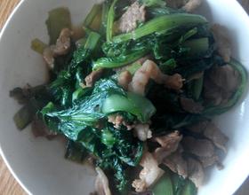 先放一点点油,炒五花肉,八分熟后,盛出,放小白菜翻炒,用勺,盛出多余的汤汁,加五花肉,加盐,少许酱油,翻炒盛出。