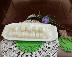 取一大平盘,撒上椰蓉,把冻好的椰奶冻倒扣在平盘上,取下保鲜膜,用刀切成小块。