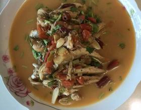 放入花椒、葱姜蒜,西红柿、干辣皮,吃辣重的可以放点青辣椒,放点盐,再放入味极鲜和香醋炖一下。