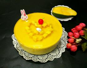 从冰箱取出慕斯糊,缓缓的倒入凉好的镜面,芒果慕斯蛋糕完成了,再放入冰箱冷藏2小时以上,我是放了一晚上。开始做梦吃吧!