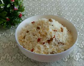 - 3. 把洗好的葡萄干放进去煮三分钟,再加入枸杞煮两分钟后用漏勺捞出米饭控干水分放入备好的器皿中。