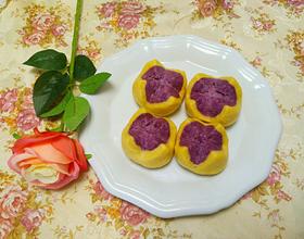 取一片南瓜面团擀开,包上一团紫薯面团,收好口捏紧。收口朝下。