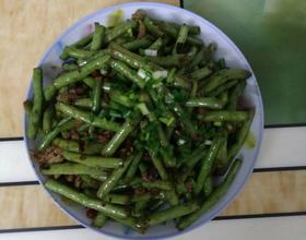 将锅洗净倒油烧热,豆角加入葱姜,豆角爆炒,用适量的水焖制,5分钟,倒入爆炒好的肉末,加入适量的豆豉,再闷两分钟