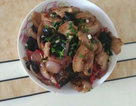 锅洗净,倒油,将油烧热,将肉,讲蒜倒入锅中翻炒两分钟,放入豆豉,豆瓣酱各一勺,再将洋葱放入锅中翻炒,在放少许白糖倒入一点温开水翻炒两分钟