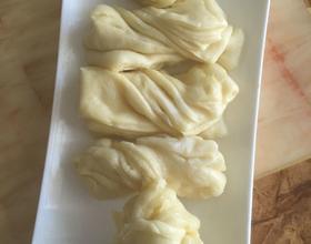 面擀长条,抹油撒面粉,从上至下折五折