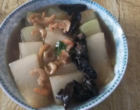 倒入冬瓜翻炒,用小火炒出水加蚝油,放进虾皮和木耳,换大火滴少许水放盐翻炒两分钟,加味精关火