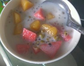 再加几块西瓜,绿豆,蜂蜜,美味的椰奶芋圆西米露就做好了