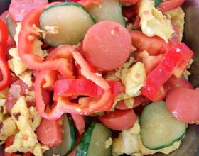 倒入酱油翻炒,把鸡蛋倒入锅中,放入红辣椒,加盐,鸡精,关火装盘