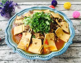 倒入切好的牛腩肉,少许料酒,酱油,蚝油,豆瓣翻炒。