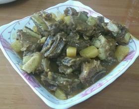 土豆炒一会儿变色后,捞出炖好的牛排倒入锅一起翻炒。