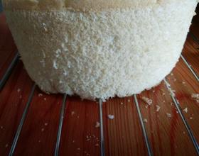 - 3. 加三分之一的蛋白霜到蛋黄糊中搅拌,不要顺时针搅拌,上下翻拌均匀,再把搅拌好的倒入剩下的蛋白霜中,上下切半均匀,倒入6寸活底模具中七八分满,多了可以放在纸杯烤,从上往下震几下震出气泡,烤一个小时左右