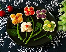 花朵饺子熟了后,用木耳菜的茎和叶装点一下,是不是像极了美丽的花朵。太漂亮了,也十分美味哟,紫薯花朵,蛋黄花朵,蛋白花朵,青红椒花朵,加上小葱肉馅打底,朵朵饺子都美味哦!