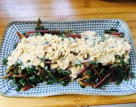 把拌好蒜泥的芝麻酱浇在马齿苋的盘中,吃的时候拌匀即可。