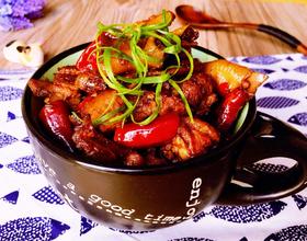 倒入干辣椒段炒香炒至鸭肉逼出多余油份