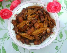 等到肉汤减少一半时,放入腐竹,翻炒均匀继续焖炖。