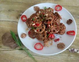 油倒走,放入葱蒜,小辣椒炒香,关火。放入藕片拌一下
