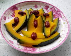 南瓜切片,摆放在盘子里,红枣片点缀。