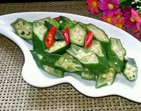 1, 焯秋葵时水中要放一点盐,这样焯出来的秋葵颜色很绿,秋葵一变色马上就捞出。