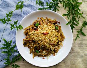 - 14. 在炒好的杏鲍菇上放花生碎,就可以了,
