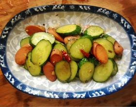 随即放入火腿、中火煸炒几分钟至火腿变色、在放入黄瓜、放半勺生抽、半糖半勺煸炒