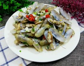 然后放入蛏子翻炒,加入少许盐和料酒翻炒