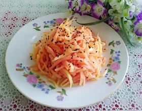 放糖,跟白醋,拌均匀,锅里放一勺油,烧热,浇在上面。
