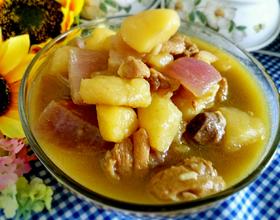 鸡腿肉要用开水焯下,去除血腥,放适量的咖喱粉,有点微辣,开胃,还能去除血腥!喜欢吃辣的还有喜欢吃香菇的可以加点辣椒和香菇哦,口味肯定棒棒的!