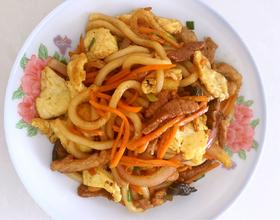 - 8. 把乌冬面放入锅中翻炒均匀。