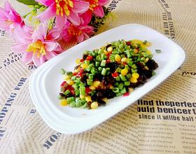 给锅里倒点油,把长豆角丁放入锅里煸炒三分钟,把黑木耳,玉米粒,红椒倒入锅里继续煸炒两分钟,加入盐和鸡精即可出锅食用。