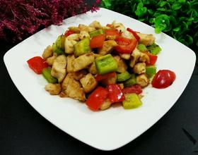 3.鸡胸肉很易熟,基本表面变白再炒片刻就可以放红绿辣椒了