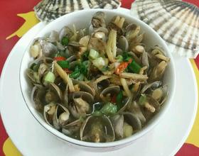 把洗净的蛏子放器皿里,加盐、味精、姜丝、辣椒、葱白下锅蒸