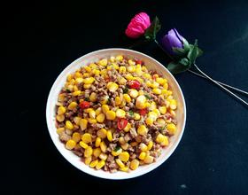 1.这道菜的玉米要用嫩玉米,最好是新鲜。 2.肉馅选牛肉猪肉的都可以,随个人喜好,腌制一会儿再炒,炒的时间稍微长点把肉炒的干酥一些口感更好。3.放红辣椒不仅使菜色更好看,而且有辣的味道更好吃。如果能吃辣,多放一些辣椒更棒。