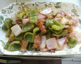 加入洋葱和菜椒,翻炒几下后倒入糖醋汁,然后加入已炸好的里脊肉继续翻炒。