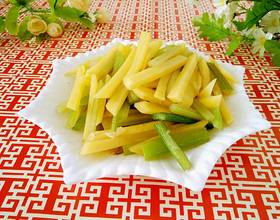 土豆条和芹菜要先用热水焯一下,否则炒的时候会把营养流失掉。因为是烫过的,所以在炒的时候稍微炒一会儿就可以。