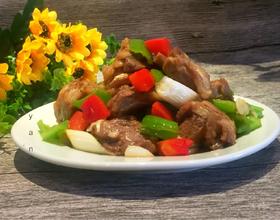 炒排骨全程大火,辣椒不用炒太久,翻炒均匀放了盐,鸡精就可以起锅了,色泽才会鲜艳
