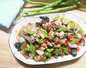 - 5. 小火焖煮20分钟后放入青椒,洋葱和干辣椒,翻炒2分钟