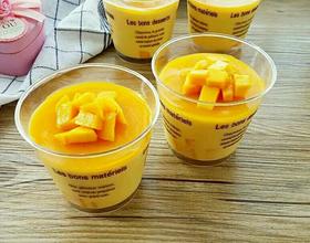 把奶油芒果糊均匀的倒入慕斯杯内,可以在每个杯子里放几粒芒果,放进冰箱冷藏定型。