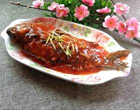 手拎着鱼尾,用勺子把油淋在鱼身上。使切过花刀处的鱼肉往外翻。