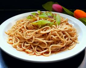 然后装到盘子中,放上焯熟的芹菜,美味的麻辣拌面就做好了,也可以放别的菜码。
