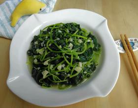 大火炒至红薯叶断青后放入蒜蓉和盐再翻炒片刻即可。