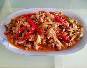 倒入兔丁翻炒。盖上锅盖焖2分钟。