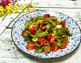 - 7. 转中大道火,加入青红辣椒炒2分钟,加入少量盐,翻炒均匀。
