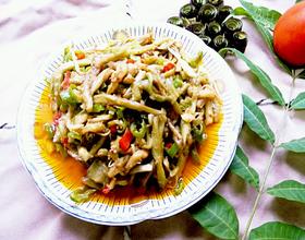 冷锅热油,油温5成,放入青红椒,姜丝蒜末爆香