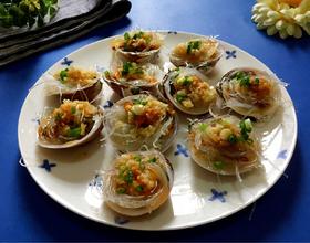 粉丝用开水浸泡二十分钟洗净切段放在贝肉里